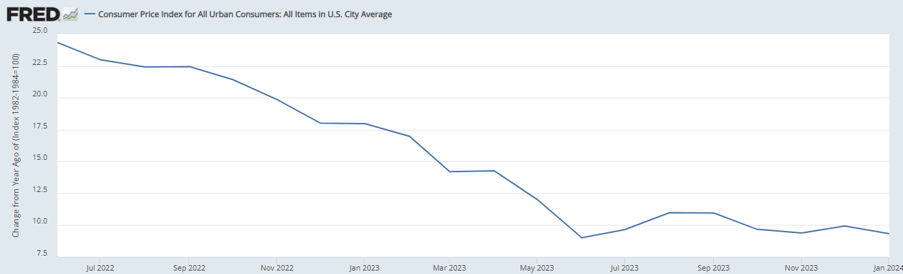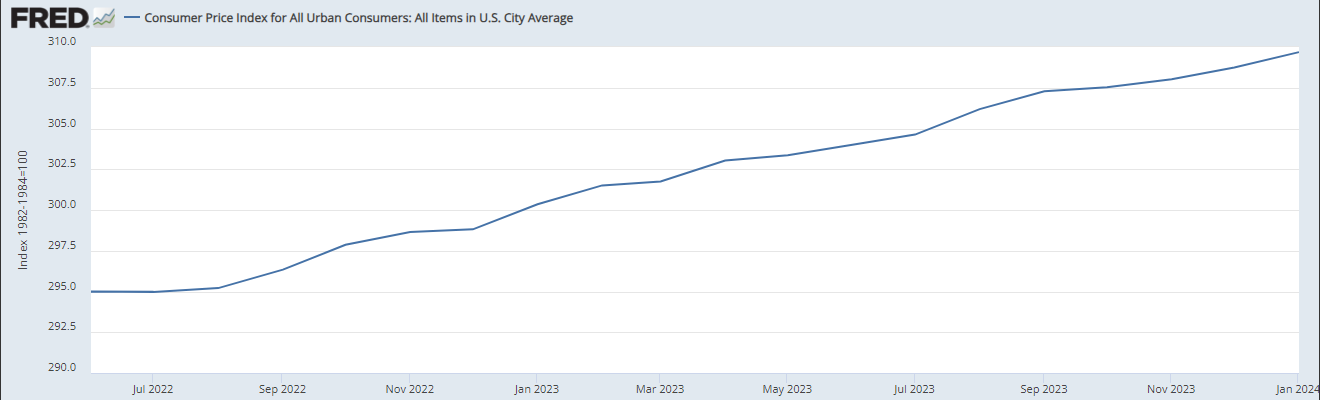 This is the same chart; the same data but shown through a different lens. This chart shows indexed inflation over the same time period as the first chart. In my humble opinion, this chart more accurately depicts the effects of inflation since June 2022. While the line has begun to level off, it clearly shows that prices are still increasing and it also shows why Americans are still struggling financially despite “cooling inflation”. Americans have not received a break and they certainly are not feeling the drop in inflation depicted in the first chart shown.